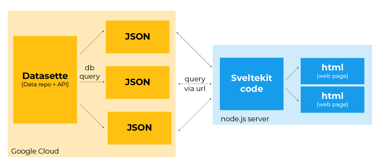 SvelteKit handles the web side. It manages routing, makes API calls to Datasette and outputs the final HTML pages your audience sees. You don’t need separate tools for each step. Everything lives in one framework.
