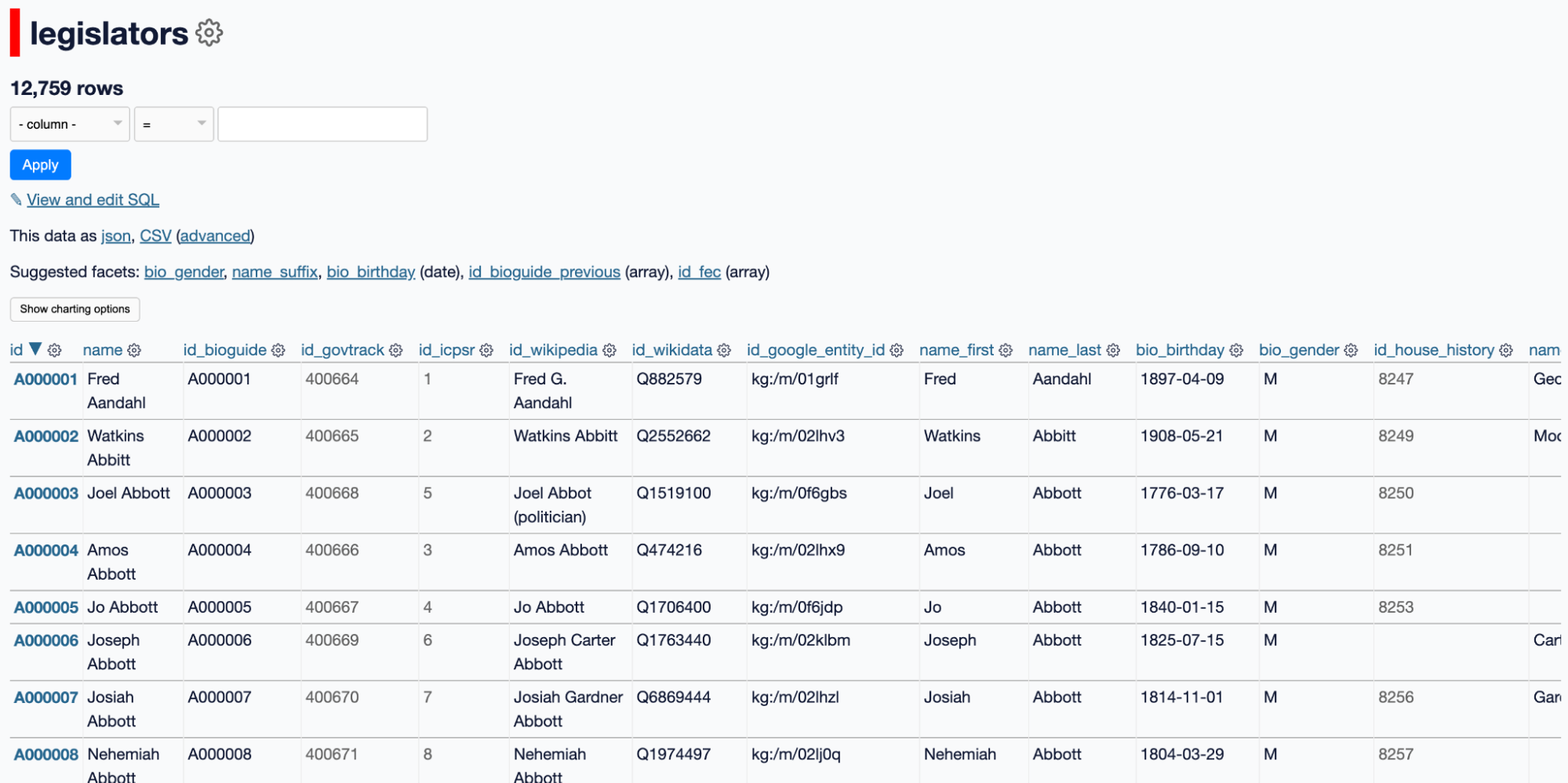 Here is a table called “legislators” from a datasette database: