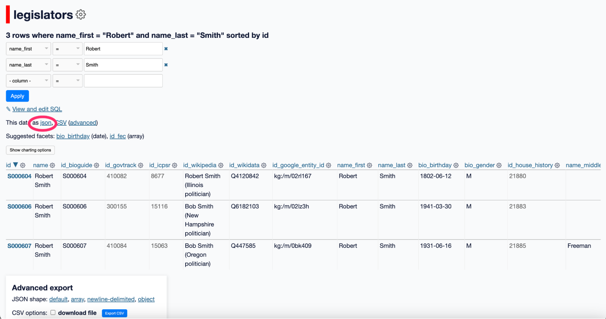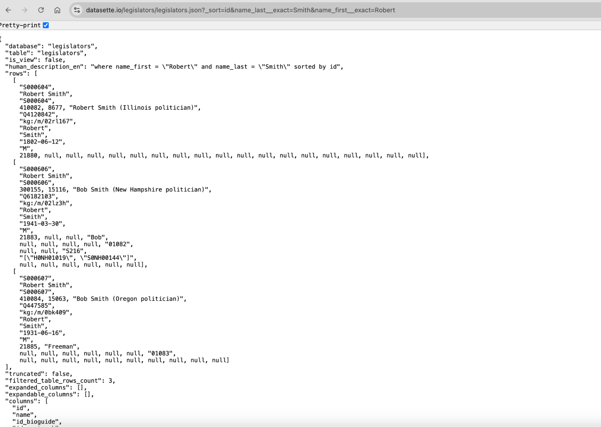 Now run a query against that table. For example, filter for legislators with the first name “Robert” and the last name “Smith.” Datasette returns only the matching rows. In this case, there are three results.