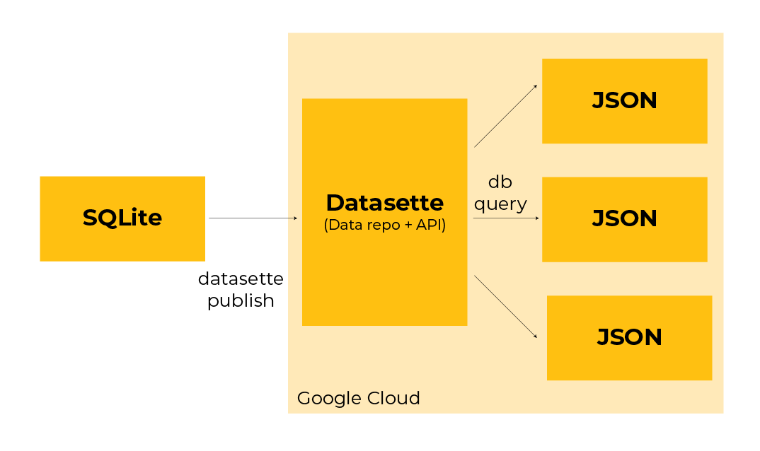 Datasette serves two roles. It acts as your main data repository, and it works as an API that delivers specific slices of data to the site as needed. You keep your data centralized and query it directly from the web.