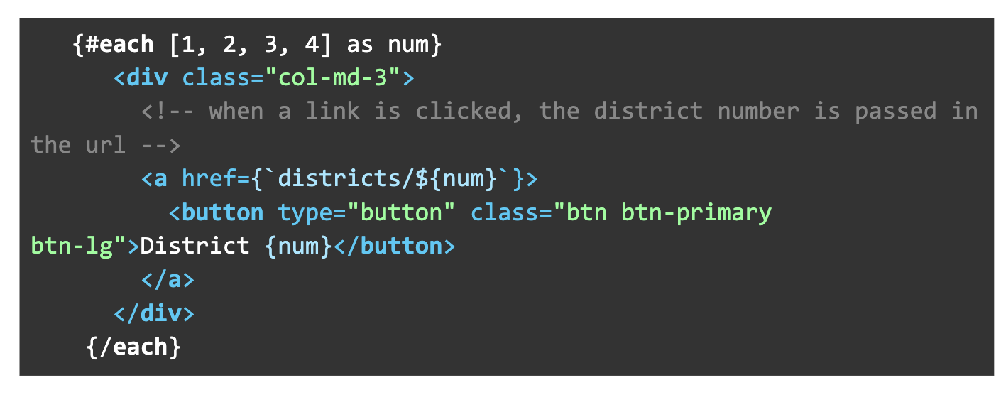 - A simple #each loop makes our buttons for each district (in this case, for 1, 2, 3, 4)