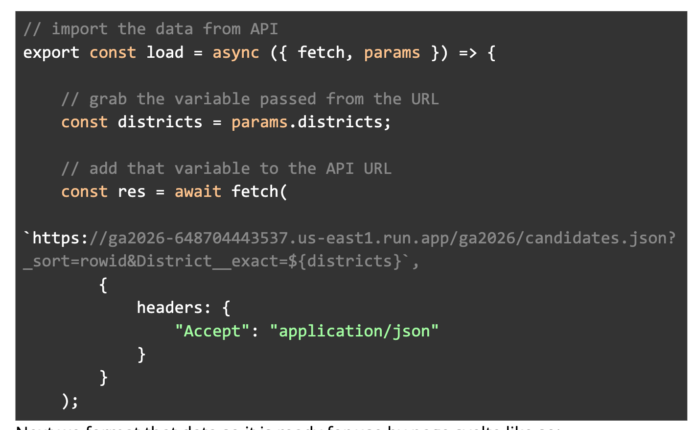 In this workflow, SvelteKit is the layer that talks to Datasette. It requests JSON data, processes it, and outputs the pages your audience sees. Every race and candidate page is built this way.
