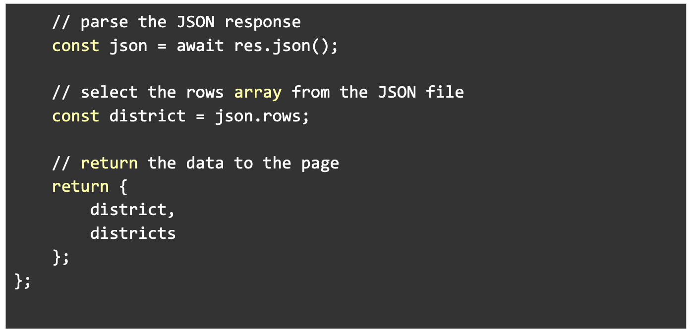 - The page.js file grabs the district number from the url via params and puts it into a variable called “districts”