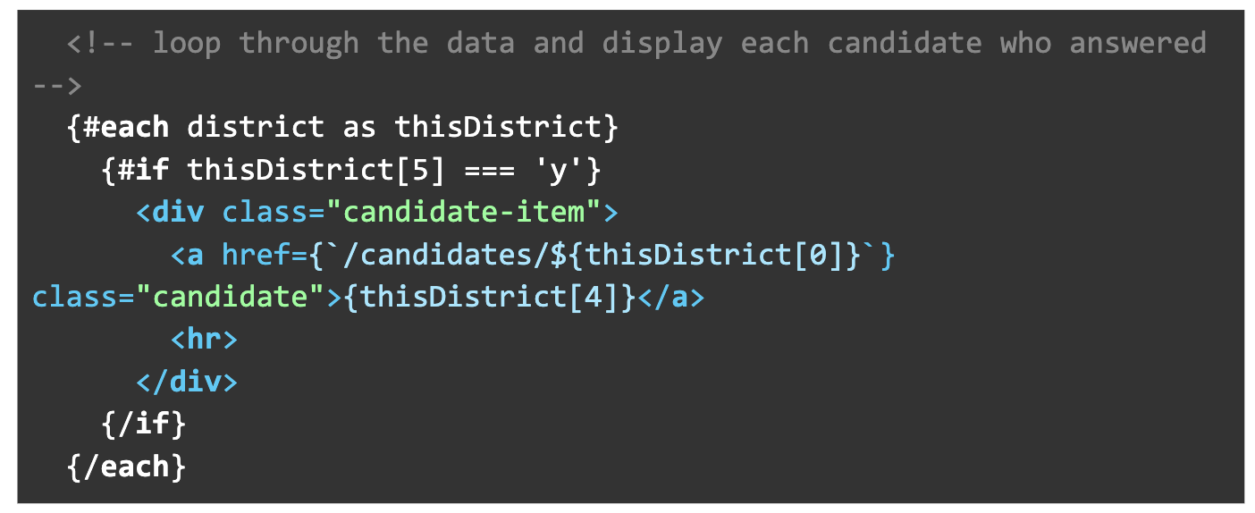 We write a conditional statement only display candidates who answered our survey (the 6th row of our data): #if thisDistrict[5] === ‘y’- {thisDistrict[4]} displays the candidate name (the 5th row of the data)