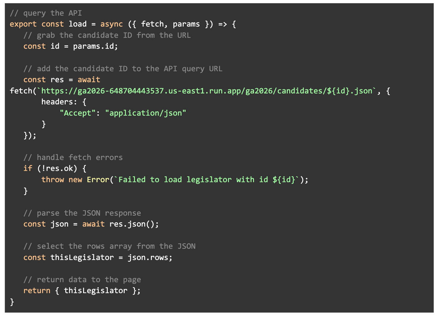 Most of the site is pretty standard and built on top of the SvelteKit boilerplate template. We will focus on reviewing the specific parts of the site / code blocks that interact with Datasette and display our candidate information.