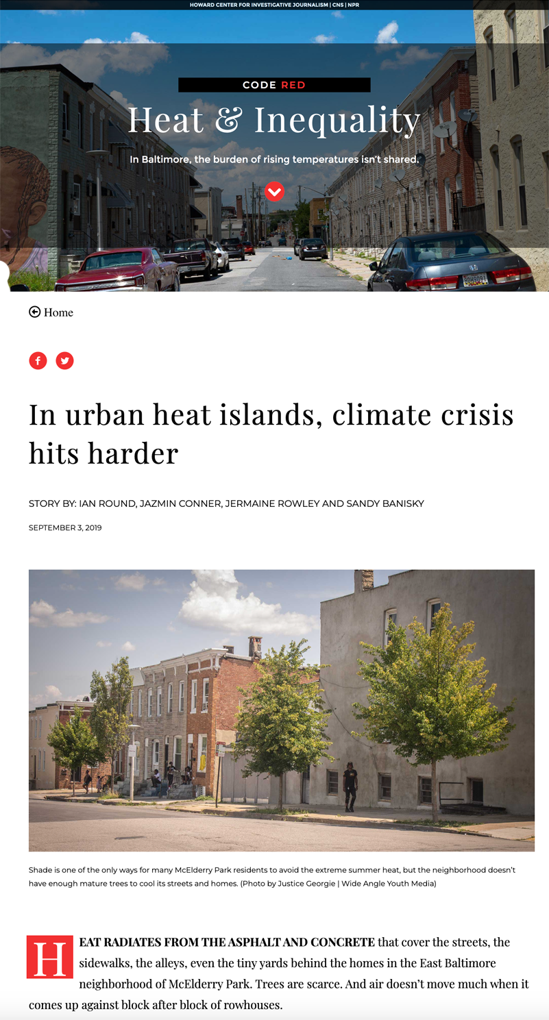 “Code Red: Baltimore’s Climate Divide” is an investigative project reporting on the relationship between climate change and poverty, examining the price that residents of “urban heat islands” pay, whether in chronic illnesses, higher crime rates or poverty. The project was a collaboration between Merrill College of Journalism and NPR. In addition to the website, stories aired on NPR, were distributed by the AP and picked up by The New York Times, The Washington Post, The Baltimore Sun and other national news organizations.